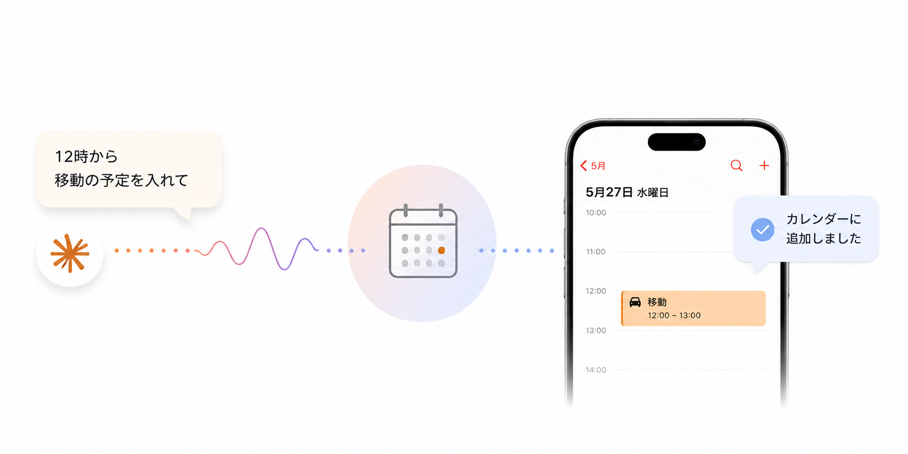 試しにプロンプトで「12時から移動の予定を入れて」と入力したところ、アクセス許可の確認ダイアログが出た後、iOSのカレンダーアプリに予定が追加されました。